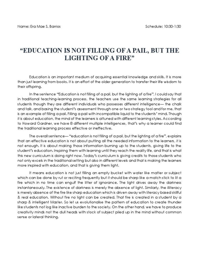 The question is part of the static syllabus of General studies paper 4 and part of Quotes Wednesdays in Mission-2022 Secure. What is the meaning of education is not the filling of a pail but the lighting of a fire. Education is not the filling of a. And their different students. If you think you know what it means please be the first to explain this quote to our readers. EDUCATION IS NOT THE FILLING OF A PAIL BUT THE LIGHTING OF A FIRE. Education is not the filling of a pail but the lighting of a fire.